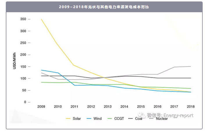 2009~2018年光伏與其他電力來源發(fā)電成本對(duì)比