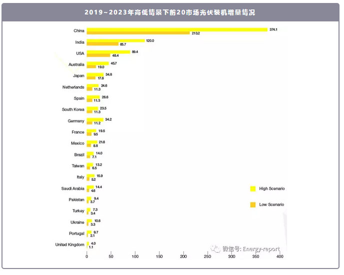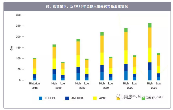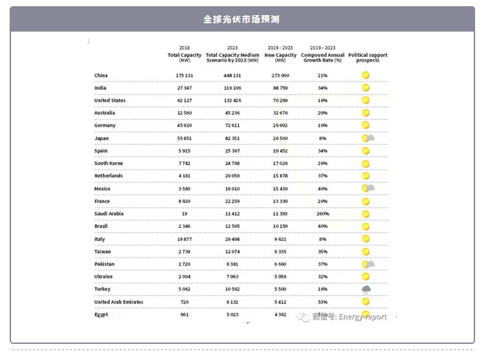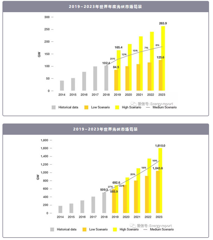 與往年一樣,《2019年全球市場(chǎng)展望》的情景顯示,與去年的《全球市場(chǎng)展望》版本相比,增長(zhǎng)更高。2019年,我們估計(jì)2019年中期情景的累計(jì)裝機(jī)容量為645GW,比去年的《全球市場(chǎng)展望》增加了約4%。我們新的5年全球市場(chǎng)前景預(yù)測(cè)加入了我們最可能的中期情景,到2023年全球太陽能發(fā)電裝機(jī)容量或?qū)⑦_(dá)到1297GW。在樂觀條件下,我們預(yù)測(cè)到2023年底,世界光伏裝機(jī)可能達(dá)到1610GW,到2021年裝機(jī)就已經(jīng)進(jìn)入太瓦裝機(jī)水平。然而,進(jìn)入太瓦時(shí)代后更有可能被銘記的一年是2022年,光伏發(fā)電量或?qū)⒄既虬l(fā)電量的4%左右。