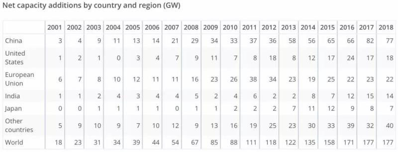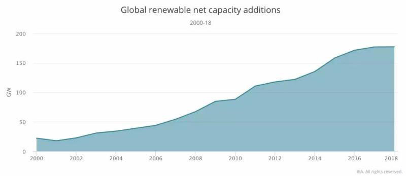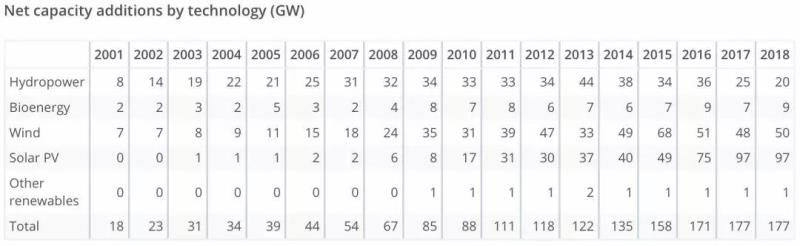 全球可再生能源發(fā)電裝機容量自2001年以來快速增長,至2017年每年新增裝機均超過上一年。但是,2018年全球新增可再生能源裝機177吉瓦,與2017年新增裝機持平,顯示全球可再生能源發(fā)電裝機的增長趨勢已經(jīng)放緩。