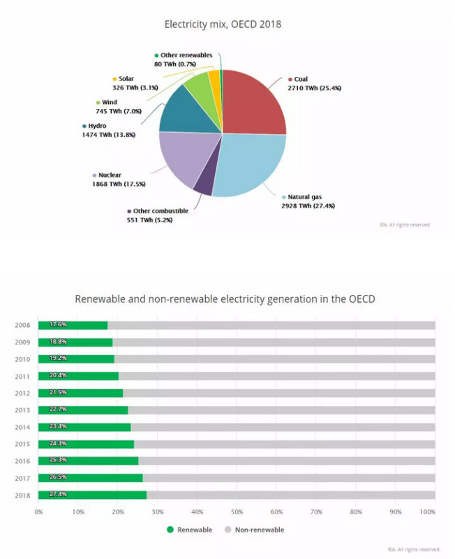 根據(jù)國(guó)際能源署最新數(shù)據(jù),2018年經(jīng)合組織36個(gè)成員國(guó)的發(fā)電結(jié)構(gòu)中天然氣比例最高,達(dá)到27.4%,其次是煤電(25.4%)、核電(17.5%)、水電(13.8%)、風(fēng)電(7.0%)、太陽(yáng)能(3.1%)、其他燃料電源(5.2%)、其他可再生能源(0.7%)??傮w而言,2018年經(jīng)合組織國(guó)家的可再生能源比例為27.4%,比2008年增長(zhǎng)9.8個(gè)百分點(diǎn);化石能源電源比例為52.8%。
