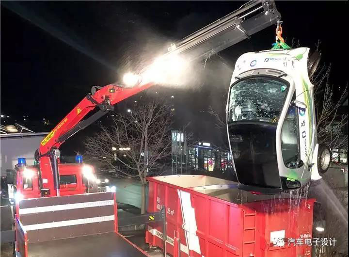 Daimler:有2臺Smart事故車,德國消防都有了經(jīng)驗準(zhǔn)備了大水箱把車子浸入了,這車小而且比較輕直接吊起來丟水里面