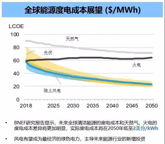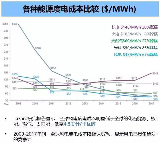 在今年金風(fēng)科技發(fā)布的報告中,與核電、火電、天燃?xì)?、光伏等能源形式相比,風(fēng)電的度電成本已經(jīng)極具競爭力。截至2017年,全球風(fēng)電度電成本已經(jīng)低至4.5美分/千瓦時(折合人民幣0.30元/千瓦時),已具備絕對的競爭力,并有望在2050年達(dá)到2美分/千瓦時(折合人民幣0.13元/千瓦時)。