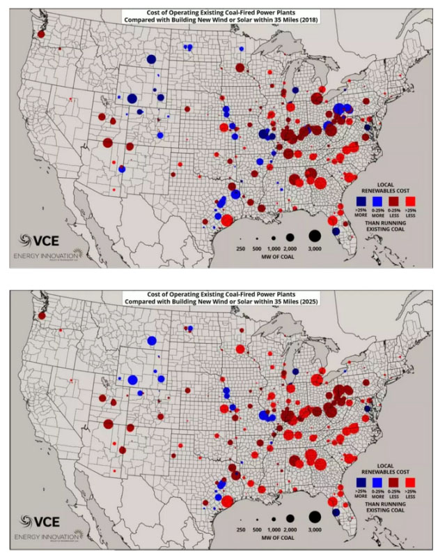 把煤電廠方圓35英里(56公里)的風(fēng)電光伏的平準(zhǔn)化成本與煤電廠運(yùn)行成本相比,可以衡量煤電廠的財(cái)務(wù)風(fēng)險(xiǎn)。具體來說,有以下四種情形: