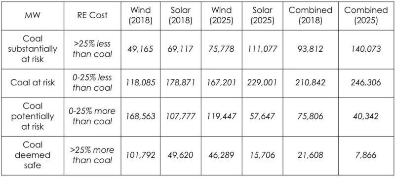 2)如果風(fēng)電光伏發(fā)電的平準(zhǔn)化成本比煤電廠的運(yùn)行成本高出0-25%的話,那么可以認(rèn)定煤電廠有潛在的財(cái)務(wù)風(fēng)險(xiǎn)(potentially at risk);
