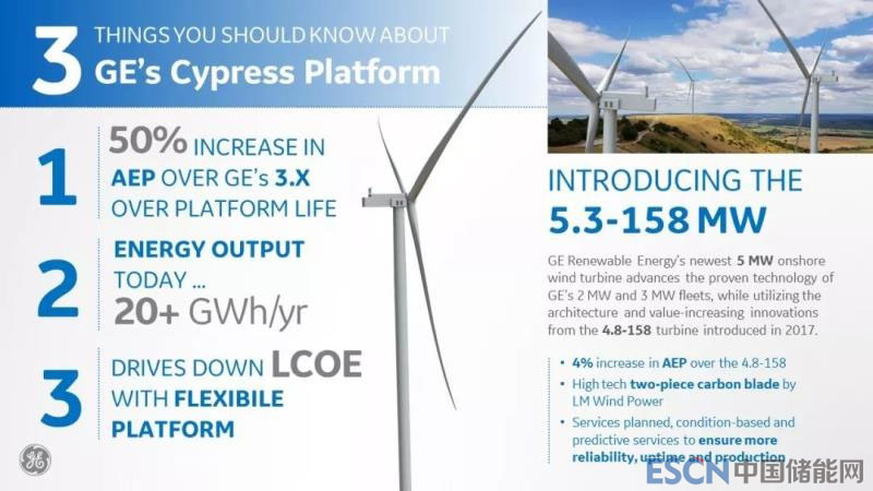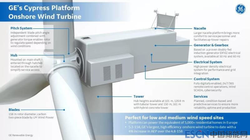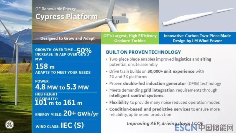 GE的Cypress平臺信息,相比3MW機型可提高50%年度發(fā)電量,風(fēng)輪直徑158米,從4.8到5.3MW,輪轂高度可從101米到161米,提高了靈活性。