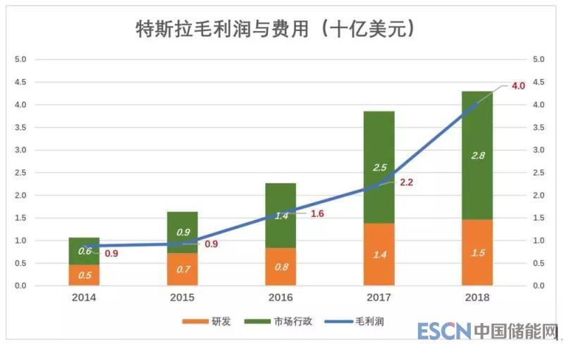 隨著銷量倍增,特斯拉經(jīng)營(yíng)狀況大為改觀。2018年毛利潤(rùn)40.4億美元,市場(chǎng)行政費(fèi)用高達(dá)28.3億美元,相當(dāng)于營(yíng)收的13.2%,14.6億美元研發(fā)費(fèi)用相當(dāng)于營(yíng)收的6.8%,兩項(xiàng)費(fèi)用合計(jì)相當(dāng)于營(yíng)收的19.6%,而這一年的毛利潤(rùn)率為18.8%,差距大大縮小。