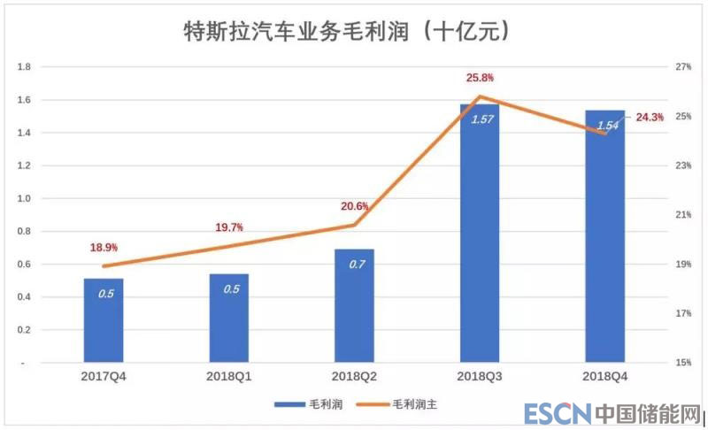 2018年H2,特斯拉低端產(chǎn)品Model 3放量交付,但公司毛利潤(rùn)率不降反升,Q3、Q4汽車業(yè)務(wù)毛利潤(rùn)分別為15.7億美元和15.4億美元,毛利潤(rùn)率分別為25.8%和24.3%。全年毛利潤(rùn)43.4億美元,較2017年增長(zhǎng)96.5%。