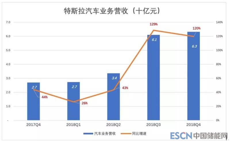 進(jìn)入2018年,隨著Model 3產(chǎn)能逐步釋放,汽車業(yè)務(wù)增速回到120%一線。Q3、Q4汽車業(yè)務(wù)收入分別為61億美元和63億美元,同比增幅分別為129%和120%。