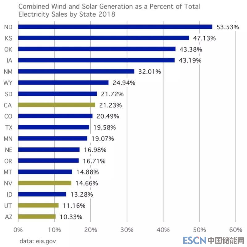 2018年美國已經(jīng)有18個州的風(fēng)電、光伏發(fā)電比例超過了10%,分別是:1)北達(dá)科他州(53.53%)、2)堪薩斯州(47.13%)、3)俄克拉荷馬州(43.38%)、4)愛荷華州(43.19%);5)新墨西哥州(32.01%);6)懷俄明州(24.94%);7)南達(dá)科他州(21.72%);8)加利福尼亞州(21.23%);9)科羅拉多州(20.49%);10)得克薩斯州(19.58%);11)明尼蘇達(dá)州(19.07%);12)內(nèi)布拉斯加州(16.98%);13)俄勒岡州(16.71%);14)蒙大拿州(14.88%);15)內(nèi)華達(dá)州(14.66%);16)愛達(dá)荷州(13.28%);17)猶他州(11.16%);18)阿利桑那州(10.33%)。