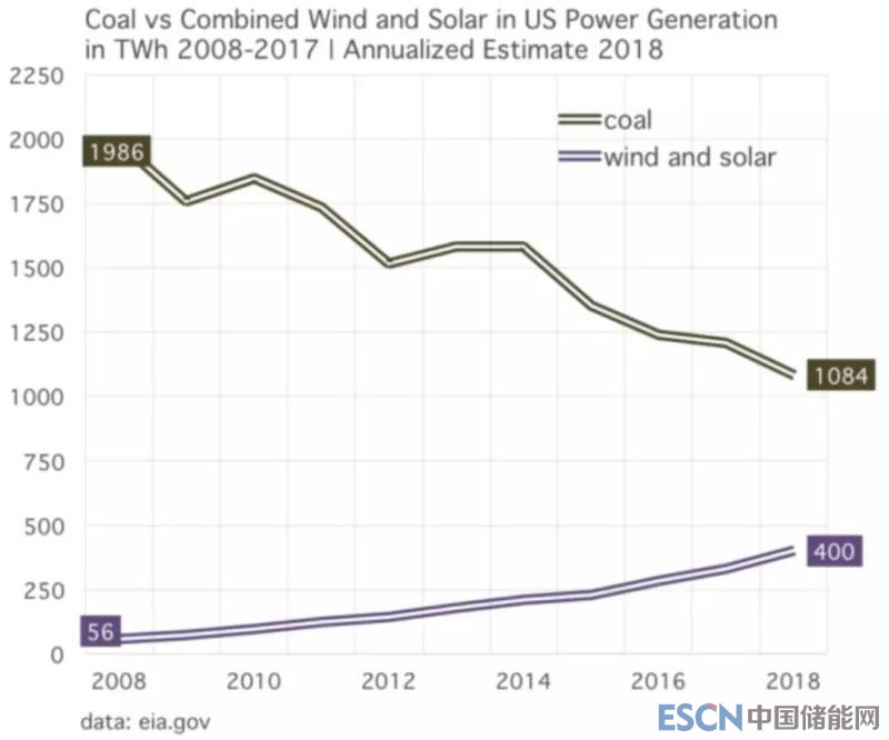 2018年美國風(fēng)電、光伏發(fā)電量約為4000億千瓦時(400 TWh),是2008年(56 TWh)的7.1倍;而2008年煤電發(fā)電量為10840億千瓦時(1084TWh),是2008年(1986TWh)的54.5%。