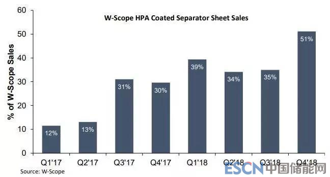 W-Scope在2018年第四季度報(bào)告中顯示,作為總銷售額的比例,HPA涂層隔板的銷售比例躍升至51%,而前四個(gè)季度的平均銷售量約為34%。W-Scope兩年前宣布,而對于2020年,W-Scope預(yù)測預(yù)期銷售收入將進(jìn)一步增加,比2019年的高出50%,主要是因?yàn)榱硗馑臈lHPA涂層隔膜生產(chǎn)線的資本支出,以應(yīng)對相關(guān)的涂層隔膜供應(yīng)合同與電動汽車行業(yè)。