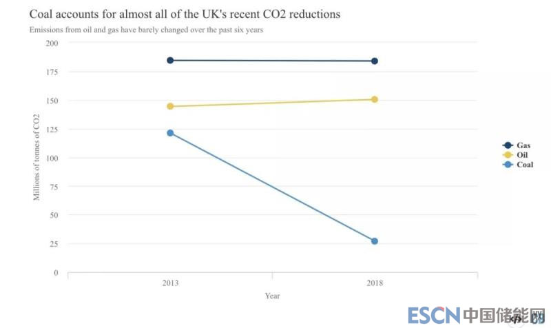 英國碳排放水平的大幅度下降主要是因為去煤化的結(jié)果。2013年至2018年期間英國碳排放下降9800萬噸,其中97%(9400萬噸)源于煤炭消費的下降。2018年英國煤電只占發(fā)電量的5%,而英國已經(jīng)確定到2025年煤電完全退出。