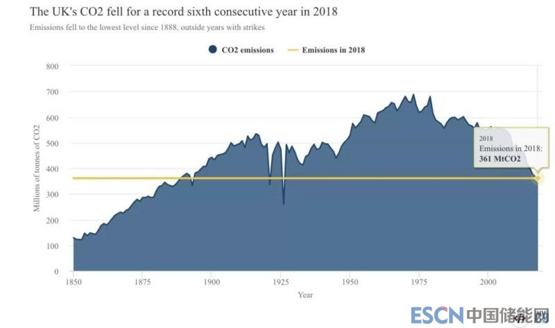 中國儲能網(wǎng)訊:根據(jù)英國Carbon Brief機構(gòu)的評估,英國2018年碳排放為3.61億噸,比1973年的排放峰值6.88億噸下降47.5%,相當(dāng)于1889年的排放水平。從人均碳排放水平來看,2018年英國人均碳排放為5.4噸,是1858年以來的最低水平。