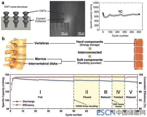 a) De Volder等人展示了一種分層的錐形碳納米管結(jié)構(gòu),類似于植物牽?;?,寬大的花冠用來承載正負(fù)極活性材料顆粒,下方細(xì)長的花柄部分與集流體部分緊密結(jié)合,在電池形變過程中,大部分應(yīng)力施加于集流體本身,錐形結(jié)構(gòu)在此期間幾乎不產(chǎn)生應(yīng)變,從而表現(xiàn)出極高的柔性。采用這種錐形結(jié)構(gòu)裝配的Fe2O3/LiNi8Co0.2O2全電池,在1C的倍率下充放電500次,仍具有88%的容量保持率。