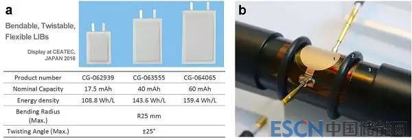 a)松下公司發(fā)布的厚度僅為0.55mm的柔性鋰電池,可適用于各類可穿戴設(shè)備。 即使以彎曲半徑為25 mm彎折,或扭曲到±25度角1000次以上后,這種柔性電池仍可保持99%的容量。