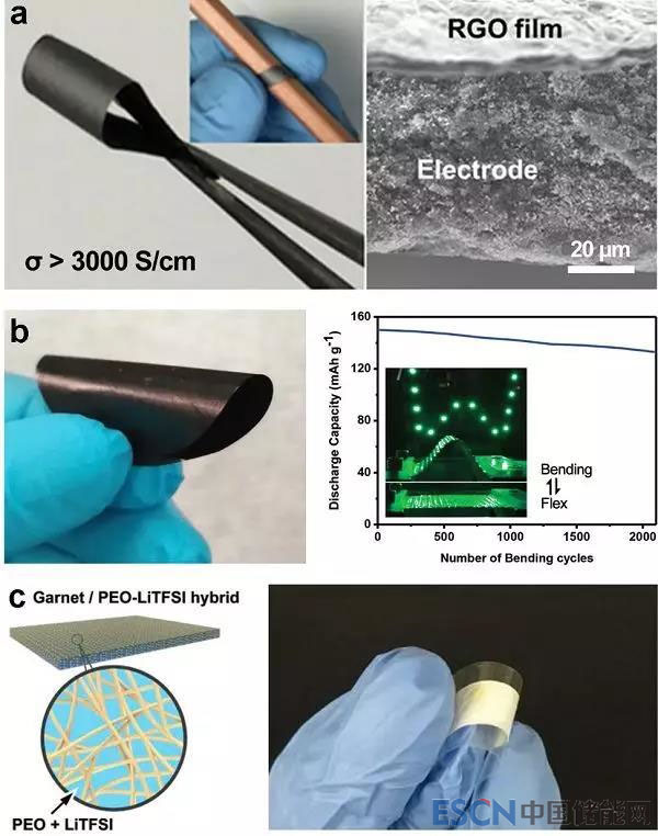 a)Liangbing Hu等人報(bào)道了一種氧化石墨烯導(dǎo)電多孔薄膜,它具有的導(dǎo)電率高達(dá)3112 S/cm。用此薄膜作為集流體裝配的柔性鋰電池,在高充放電倍率(5C)循環(huán)100次后,并未發(fā)現(xiàn)容量的明顯衰減。
