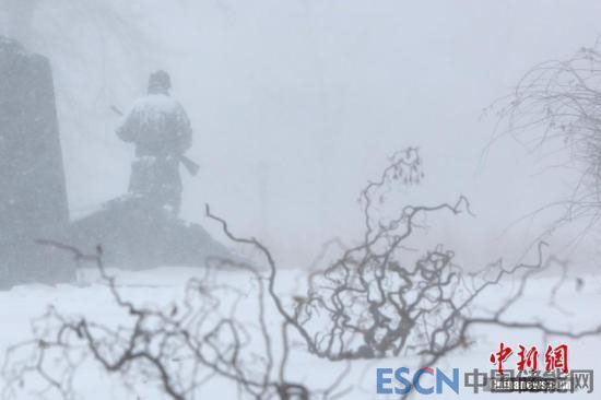 資料圖:當?shù)貢r間2018年1月4日,暴雪中紐約法拉盛公園中的雕塑。當日,紐約降下2018年首場暴雪。受一波被稱為“炸彈氣旋”的風暴影響,美國東北部地區(qū)當天普遍遭受暴雪襲擾,3000多個航班因此取消 中新社記者 廖攀 攝