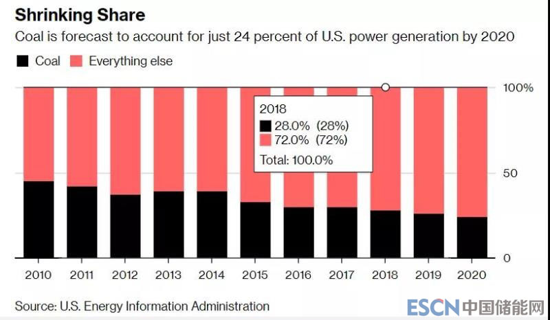 中國(guó)儲(chǔ)能網(wǎng)訊:根據(jù)彭博社轉(zhuǎn)引美國(guó)能源信息署的數(shù)據(jù),2010年美國(guó)煤電比例為45%,此后逐年下降。2017年煤電比例為30%,2018年進(jìn)一步下跌至28%。2018年美國(guó)有18座煤電廠退役,創(chuàng)造歷史上煤電退役的最高水平;預(yù)計(jì)2019年仍將有14座煤電廠退役。美國(guó)能源信息署預(yù)測(cè),2020年美國(guó)煤電比例僅剩24%。