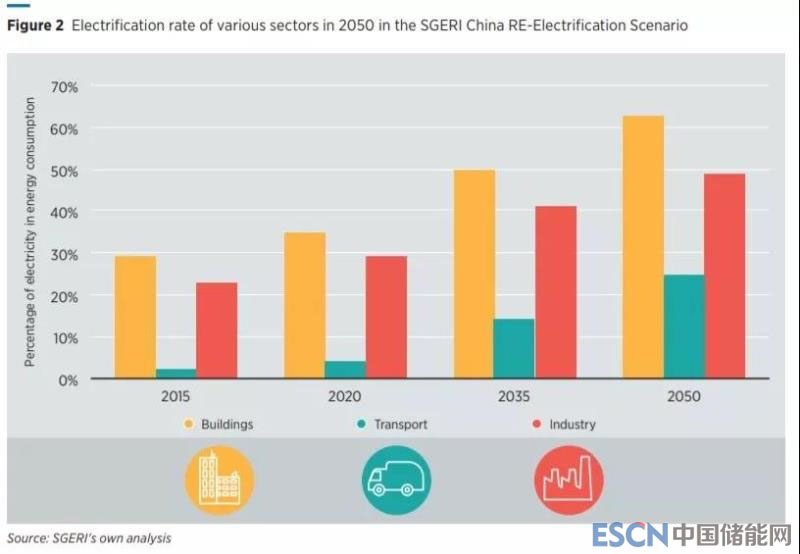 在中國,國家電網(wǎng)能源研究所(SGERI)的研究表明,中國最終能源使用總量中的電力份額可能會從目前的21%增長到2050年的47%。2015年至2050年能源使用總量將增加約30%,而電力消耗將增長140%。同時中國電力供應(yīng)將發(fā)生結(jié)構(gòu)性的改變,到2050年可再生能源將提供66%的發(fā)電(太陽能光伏和風(fēng)力發(fā)電占41%)。建筑物的再電氣化可能性特別高,預(yù)計到2050年電力在建筑能源消耗中的份額將從目前的29%增加到63%;工業(yè)和運輸部門能耗的電力份額將分別達到49%和25%。
