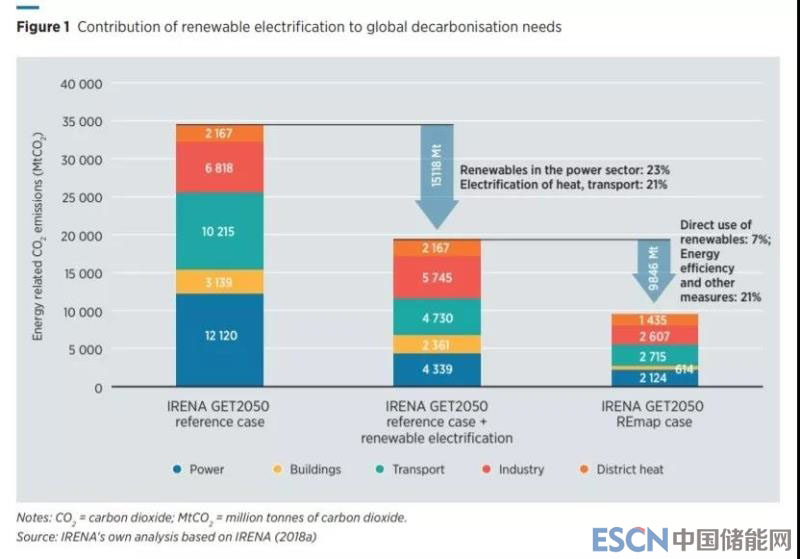 雖然電力消費在增加,但是減少了總能量需求,如電氣化的供熱和運輸系統(tǒng)的效率高于化石燃料。IRENA認(rèn)為全球范圍內(nèi)建筑物用能電氣化的潛力最高(2050年可達50-80%),其次是工業(yè)部門(34-52%),然后是運輸部門(10-52%)。IRENA預(yù)測,2050年全球可以使用十億輛電動汽車,使用熱泵的供暖的建筑物可能會增加十倍,數(shù)量可能超過2.5億臺。