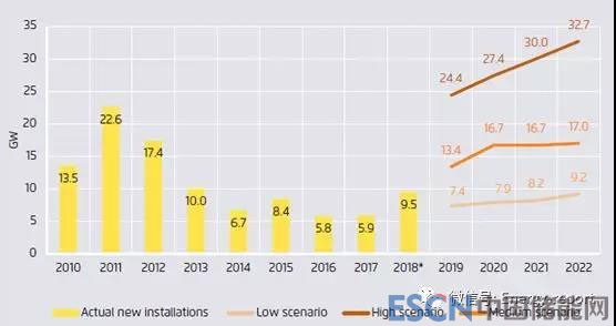 風電很強,但是光伏已經(jīng)做好準備!2018年,可再生能源在歐盟發(fā)電量中占比上升至32.3%。雖然今年的增長主要是由于風電發(fā)電量增長有所回升以及水電發(fā)電量恢復正常,但是光伏是2018年真正的“熱門”:2018年歐洲光伏新增裝機容量或?qū)⑼仍鲩L60%以上,達到近1000萬千瓦,到2022年裝機容量可能增加兩倍,達到3000萬千瓦。2018年,組件價格同比下跌29%。在2018年夏季“熱浪”中,光伏的表現(xiàn)超過了煤電、核電、風電和水電。2018年,意大利、法國和西班牙分別起草了大膽的國家太陽能發(fā)展計劃(2030年)。2018年歐盟商定的2030年可再生能源目標將帶來更多成果。