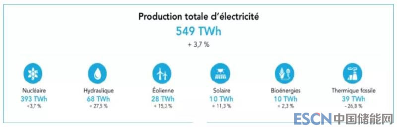 2018年全年法國本土的發(fā)電總量549TWh(5490億千瓦時),其中核電393TWh(71.6%)、水電68TWh(12.4%)、風(fēng)電28 TWh(5.1%)、火電39TWh(7.1%)、太陽能發(fā)電10TWh(1.8%)、生物質(zhì)發(fā)電10TWh(1.8%)。