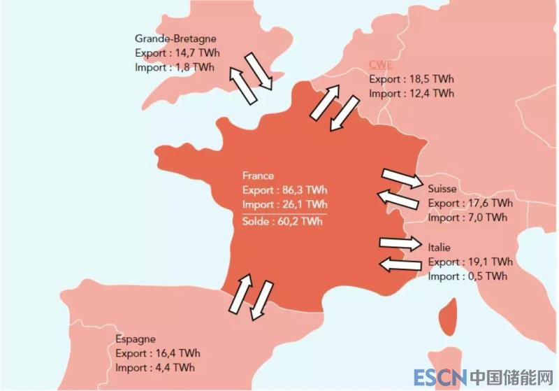 中國儲能網(wǎng)訊:根據(jù)法國國家電網(wǎng)RTE最新發(fā)布的統(tǒng)計數(shù)據(jù),2018年法國電力出口86.3TWh(863億千瓦時),進(jìn)口26.1TWh,凈出口60.2TWh。相對于法國的主要鄰國,以核電為主(發(fā)電量占71.6%)的法國均為凈出口國。