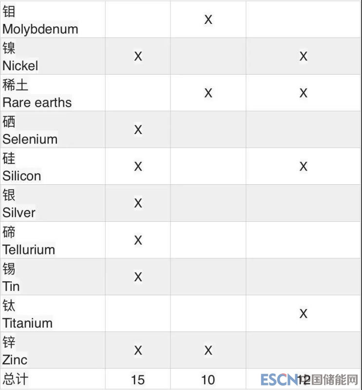 總結一下,太陽能技術對于各種金屬材料依賴較大(15種);其次是電動汽車/儲能(12種)、風能(10種)。也就是說,太陽能、儲能相關技術對于金屬材料的依賴使得其較受地理政治(金屬材料資源分布)的影響,風能技術受地理政治影響相對比較小。