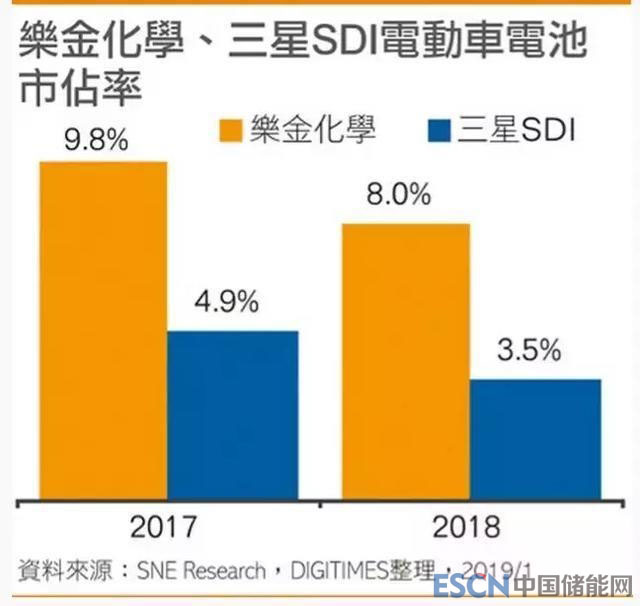 韓媒DigitalTimes引述市調(diào)機(jī)構(gòu)SNE Research最新公布的資料,指出如以2018年11月底為基準(zhǔn),2018年全球電動汽車電池出貨量排名,樂金化學(xué)、三星SDI市占率分別為8.0%及3.5%,相較2017年同期的9.8%與4.9%,分別減少1.8個及1.4個百分點(diǎn)。