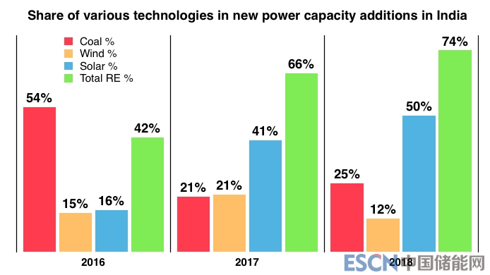 中國(guó)儲(chǔ)能網(wǎng)訊:根據(jù)印度最新統(tǒng)計(jì)數(shù)據(jù)顯示,印度在2018年增加了17.6吉瓦的總發(fā)電量(凈),其中74%基于可再生能源技術(shù)(主要是太陽(yáng)能發(fā)電),創(chuàng)下歷史新高,至此,2018年成為迄今為止新增產(chǎn)能最環(huán)保的一年。