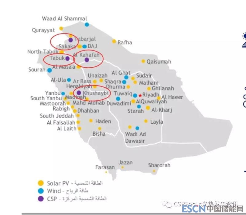 據(jù)CSP Focus光略咨詢了解到,為達(dá)成2030年58.7GW總裝機(jī)的目標(biāo),沙特政府規(guī)劃了超過35個(gè)新能源園區(qū),其中包含4個(gè)光熱發(fā)電園區(qū)項(xiàng)目(如下圖所示)。