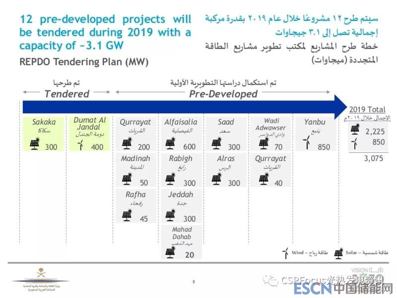 目前,沙特方面已經(jīng)開始著手此項(xiàng)雄偉新能源計(jì)劃的具體實(shí)施。2019年將開展對(duì)12個(gè)新能源項(xiàng)目(總裝機(jī)3,075MW)的對(duì)外招標(biāo)工作,其中11個(gè)太陽能項(xiàng)目(總裝機(jī)2,225MW),1個(gè)風(fēng)能項(xiàng)目(850MW)。