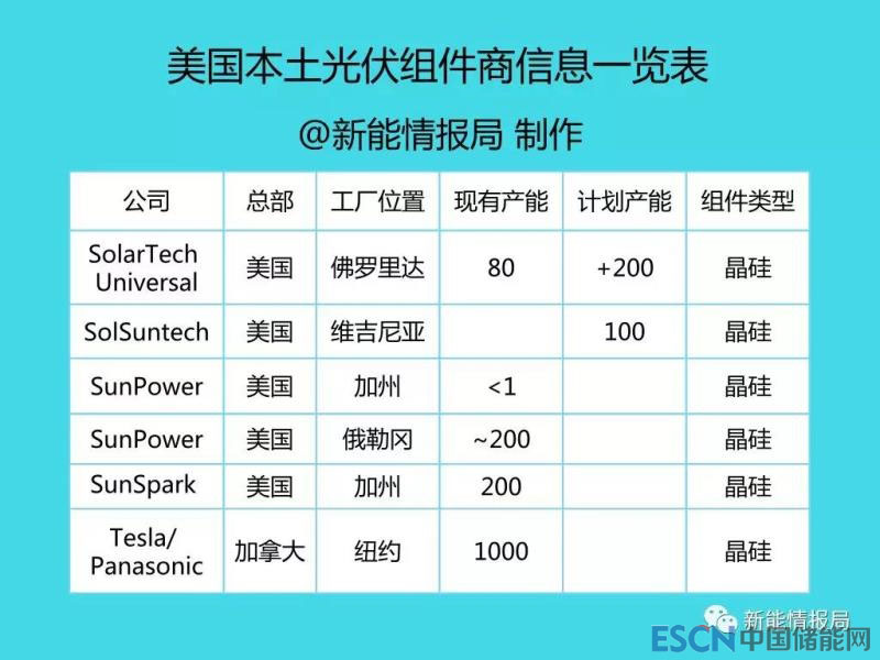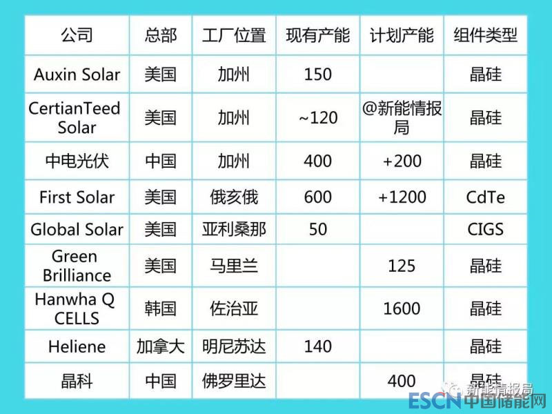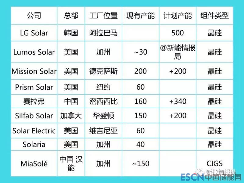 為了更深入了解美國本土光伏組件制造情況,新能情報局對美國境內(nèi)光伏組件制造相關(guān)情況進行了不完全統(tǒng)計,具體信息如下:
