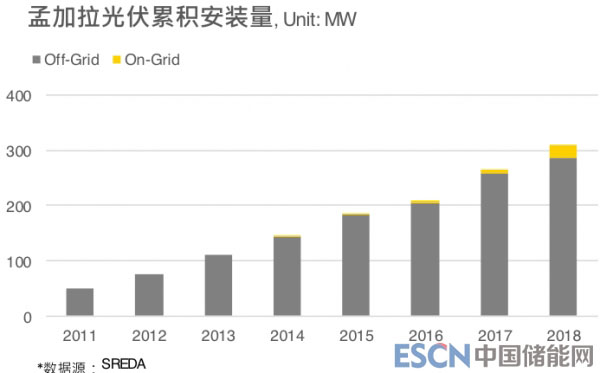 目前孟加拉總體安裝量為325.82MW,其中離網(wǎng)項(xiàng)目每年需求皆有穩(wěn)定的成長,截至2011-2018年平均每年新增約35MW的安裝量,累積安裝量至今已達(dá)286.72MW,占總體安裝量的88%。并網(wǎng)項(xiàng)目截至目前累積安裝量僅39.1MW,占總體安裝量的12%。