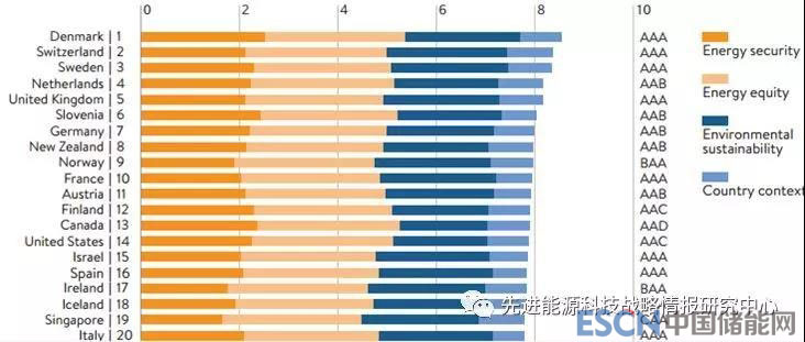 就125個國家“三難困境指數(shù)”綜合得分來看,得分高排名領先的國家與2017年保持一致。其中丹麥、瑞士和瑞典依舊位列“能源三難困境”指數(shù)榜單前三甲,而荷蘭、英國、斯洛文尼亞、德國、新西蘭、挪威和法國分列4-10位。值得注意的是,在這10個國家中,除了新西蘭以外全部是歐洲國家,既包括了可再生能源領跑者丹麥,也包括維持煤電的德國和以核電為主的法國,表明歐盟到2020年的能源和氣候政策很好地促進了歐洲的能源系統(tǒng)發(fā)展。盡管綜合排名前10的國家主要是發(fā)達經(jīng)濟體,但也出現(xiàn)了斯洛文尼亞這種中等發(fā)展水平的國家,表明了構(gòu)建穩(wěn)健平衡的能源系統(tǒng)并非只是“奢侈品”,通過智慧和綜合政策措施是完全可以獲得的。