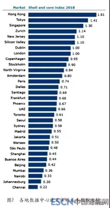 Turner&Townsend也公布了各地數(shù)據(jù)中心建筑體的成本指數(shù)比較(見圖2):上海和北京依然可以排列為全球最具成本競爭力的數(shù)據(jù)中心目的地之一。中國具備相對有競爭力的勞力成本,也是很多數(shù)據(jù)中心機電設備的原產地,也令本地建設成本更具競爭力。