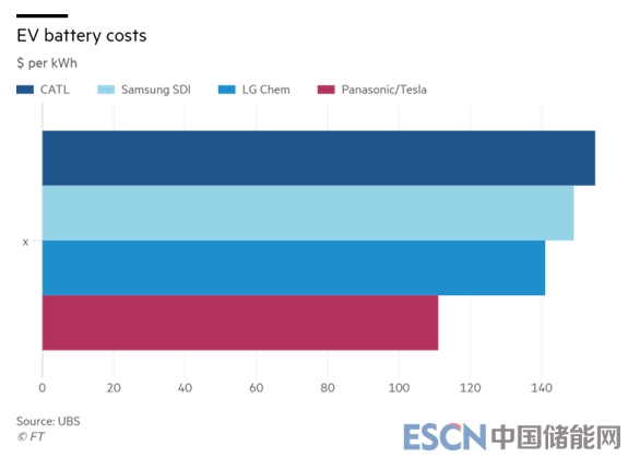 瑞銀分析師Colin Langan表示,對(duì)特斯拉/松下、LG化學(xué)、三星SDI以及寧德時(shí)代(CATL)生產(chǎn)的鋰離子電池進(jìn)行拆解分析,特斯拉/松下的21700型圓柱形鋰離子電池的成本為111美元/kWh,比LG化學(xué)公司的148美元/kWh低37美元,擁有明顯的成本優(yōu)勢(shì)。而目前寧德時(shí)代的成本超過(guò)150美元/kWh,稍遜于三星SDI名列第四名。