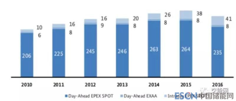 直到2016年,德國日內(nèi)市場交易量不斷上升,2016年達到41TWh,。2016年基礎負荷小時產(chǎn)品平均價格為每兆瓦時37.52歐元,高峰負荷小時產(chǎn)品平均價格為45.24歐元。