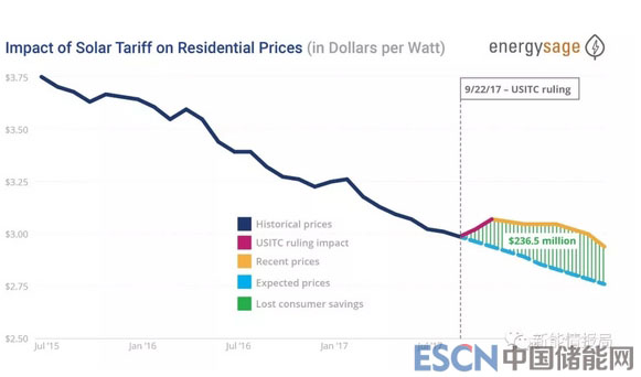 在2017年9月底,美國(guó)國(guó)際貿(mào)易委員會(huì)(International Trade Commission)認(rèn)為美國(guó)光伏組件商受到損害后不久,EnergySage發(fā)現(xiàn)市場(chǎng)上的戶(hù)用太陽(yáng)能價(jià)格開(kāi)始飆升。