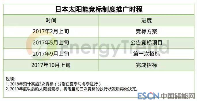 此外,日本于2017年10月導(dǎo)入太陽(yáng)能競(jìng)標(biāo)制度,希望透過(guò)競(jìng)標(biāo)制度來(lái)推動(dòng)降價(jià)。日本經(jīng)產(chǎn)省針對(duì)太陽(yáng)能競(jìng)標(biāo)制度的推廣時(shí)程為:2017年二月上旬推出競(jìng)標(biāo)方案、5月上旬公告競(jìng)標(biāo)項(xiàng)目、9月上旬展開(kāi)第一次招標(biāo),并于10月上旬完成。2017年會(huì)先實(shí)施第一次太陽(yáng)能競(jìng)標(biāo),2018年則預(yù)計(jì)實(shí)施2次競(jìng)標(biāo)(分別在夏季與冬季進(jìn)行),共規(guī)劃了三次標(biāo)案。2019年度以后的太陽(yáng)能競(jìng)標(biāo),則將考量前三次競(jìng)標(biāo)的執(zhí)行狀況后再做決定。