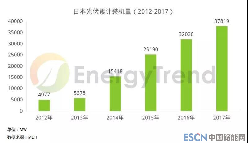 2012年至2017年,日本可再生能源發(fā)電的裝機(jī)量年均增速達(dá)到26%,光伏產(chǎn)業(yè)為主要增量。2012年日本光伏累計(jì)裝機(jī)量為4.977GW,根據(jù)集邦咨詢旗下新能源研究中心集邦新能源網(wǎng)EnergyTrend統(tǒng)計(jì),截止2017年底,日本光伏累計(jì)裝機(jī)量為37.819GW,包含屋頂光伏裝機(jī)量5.19GW。2017年日本光伏新增并網(wǎng)裝機(jī)量為5.799GW,較2016年的6.83GW,下降了約15%。