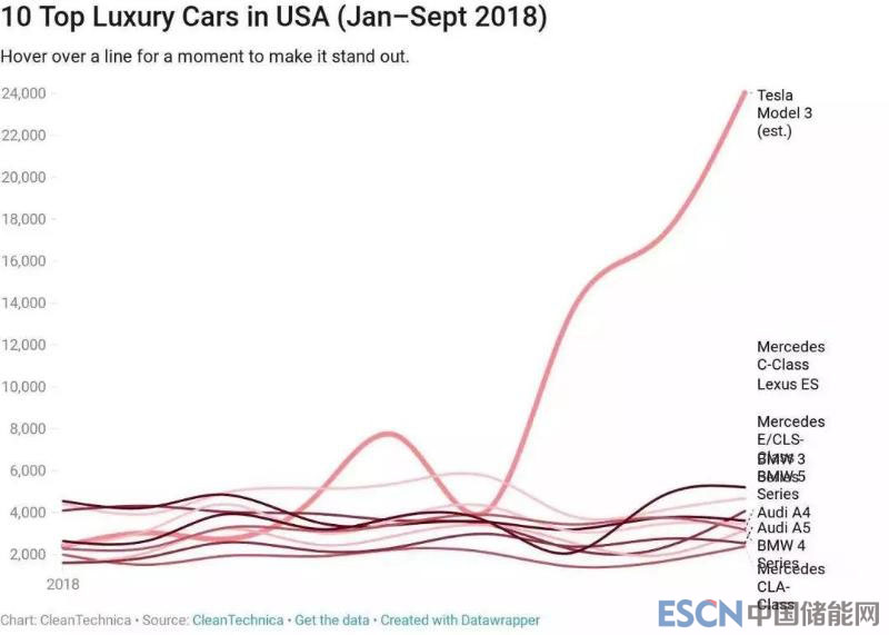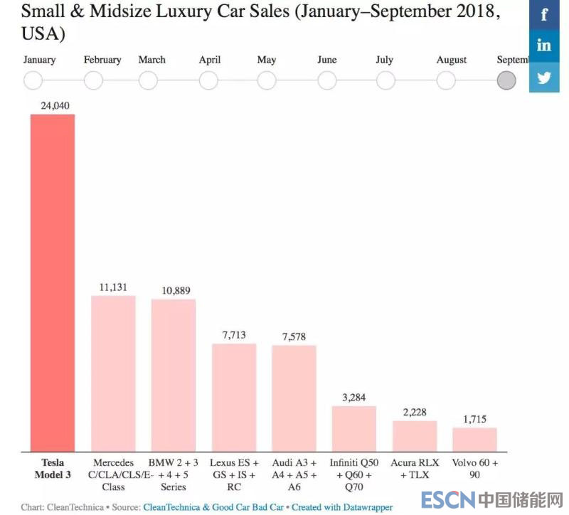 憑借Model 3一款車型,特斯拉更是將一眾豪華品牌打得落花流水。9月份,Model 3美國(guó)地區(qū)交付量達(dá)到22250輛,單款車型銷量超過了BMW 2 + 3 + 4 + 5系和奔馳C/CLA/CLS/E-Class銷量之和。