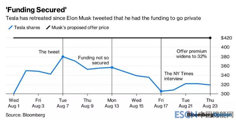 馬斯克將特斯拉私有化的計(jì)劃遭到了多方質(zhì)疑,資金也并未得到真正的落實(shí)。特斯拉的股票開始持續(xù)下跌。8 月15 日,SEC 加強(qiáng)了對(duì)特斯拉的調(diào)查力度,向公司發(fā)出了傳票。