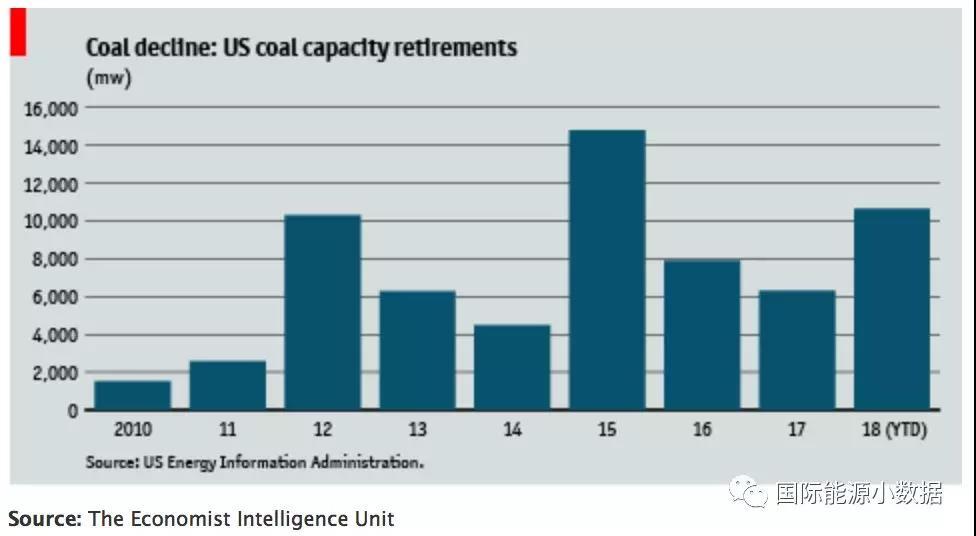 自2010年以來,美國的煤電裝機持續(xù)下降。根據(jù)EIA的數(shù)據(jù),2010年煤電裝機達到316,800兆瓦,但截至2018年6月已下降到246,000兆瓦,降幅超過22%。燃煤電廠的衰退主要是市場原因,由于頁巖氣革命導致天然氣價格暴跌,使得天然氣發(fā)電廠更具競爭力。同時,電力消費也停滯不前,而美國的能源使用效率正在提高。風能和太陽能發(fā)電的成本也急劇下降,而州和聯(lián)邦一級的一系列政策,如可再生能源的授權和稅收抵免,也有助于可再生能源發(fā)電的加速。因此,一系列市場和政策因素導致過去五年煤電產(chǎn)能急劇下降,特朗普無力回天。