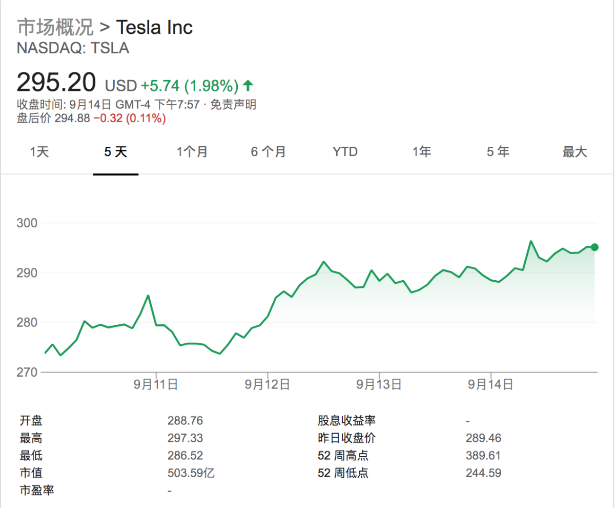 9月15日周五,特斯拉股價收于295.20美元,全周漲12%。該股票在過去30天內(nèi)下跌15%,并從52周高點下跌24%。