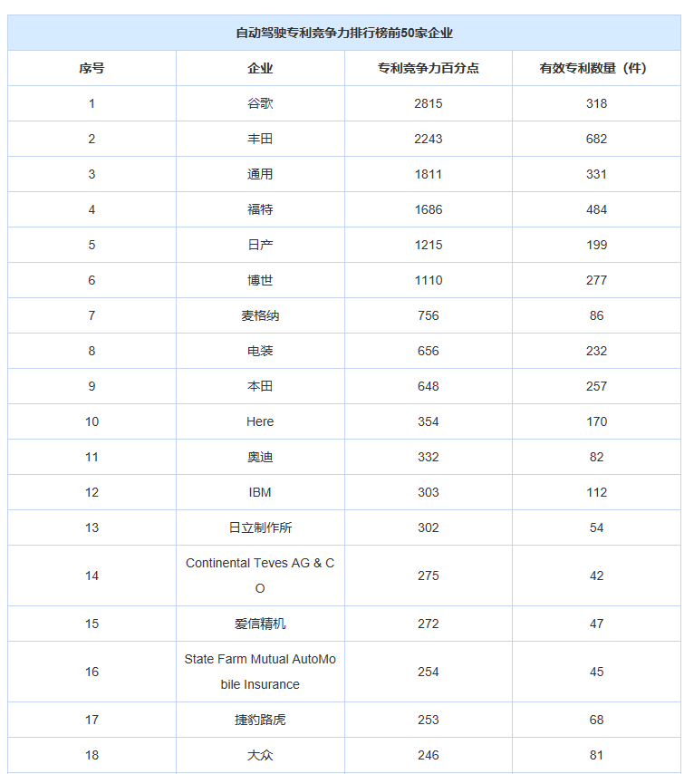 Patent Result對(duì)截至今年7月底的美國(guó)自動(dòng)駕駛專利競(jìng)爭(zhēng)力進(jìn)行排名。位居榜首的是谷歌Waymo,綜合得分2815分。而兩年前的調(diào)查中,Waymo還位居豐田、通用、日產(chǎn)、德國(guó)-博世之后名列第五。