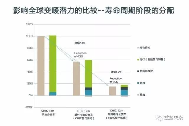 對(duì)燃料電池公共汽車的全生命周期分析可以得出:與相應(yīng)國(guó)家最先進(jìn)柴油公交車相比,應(yīng)用混合來源的氫燃料電池可以降低43%的溫室效應(yīng)潛值。如果氫能全部來自清潔能源,那么溫室效應(yīng)潛值可以下降85%。