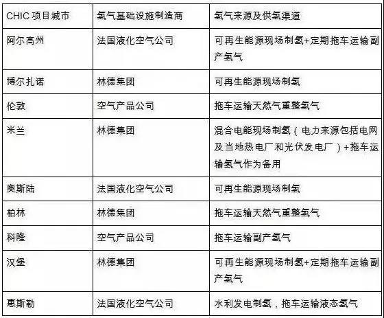 (歐洲CHIC項(xiàng)目可再生能源制氫示范城市匯總表)