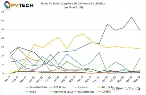 自2017年二季度以來,天合光能一直是特斯拉最大的供應商, 其市場份額從2017年10月的最高點45%降至2018年5月的28%。