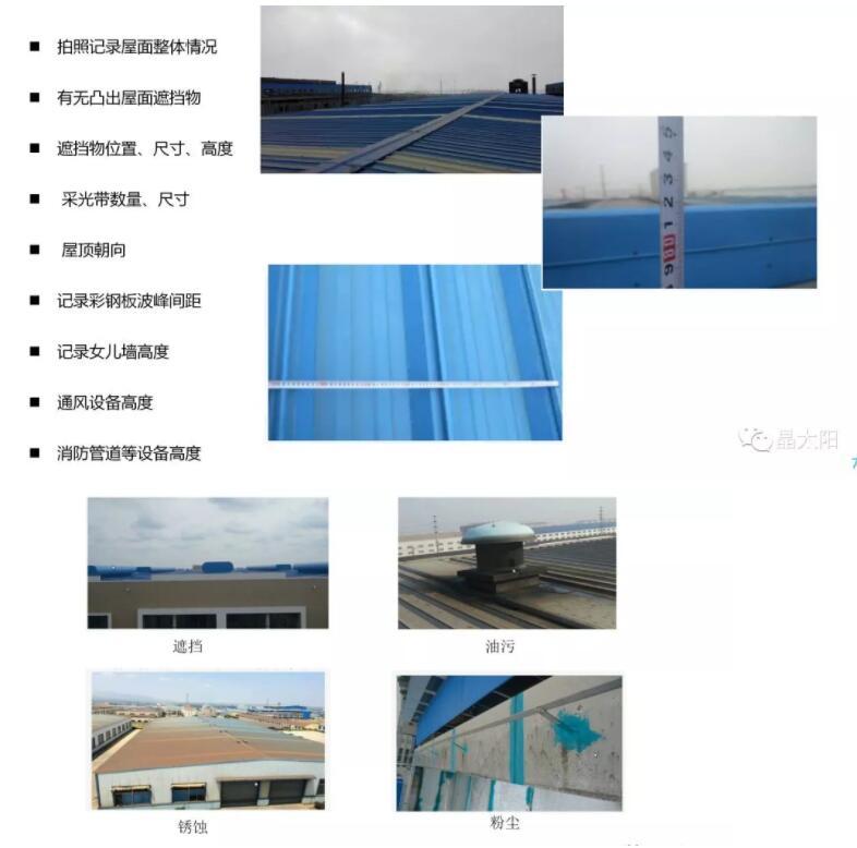 廠區(qū)平面,結構,建筑、電氣等圖紙,屋頂,配電房等照片。有了這些圖紙,可以初步評估屋頂是不是具備建設光伏電站的條件,以及預估可建設的電站容量。